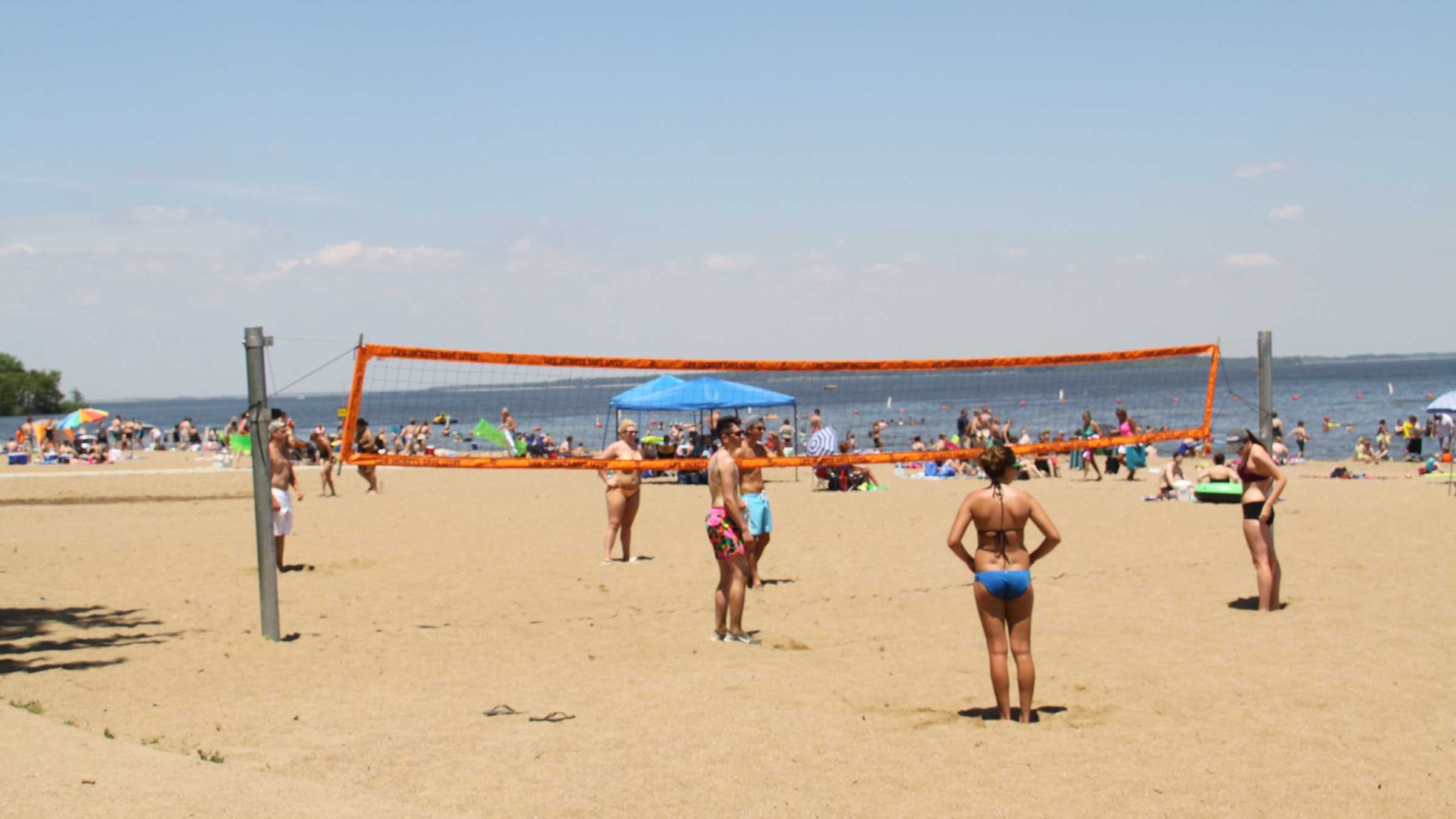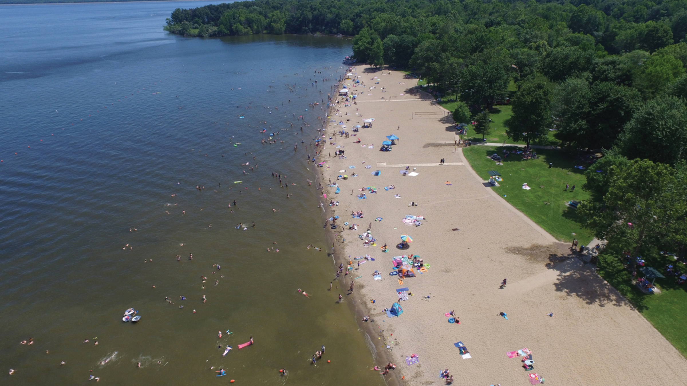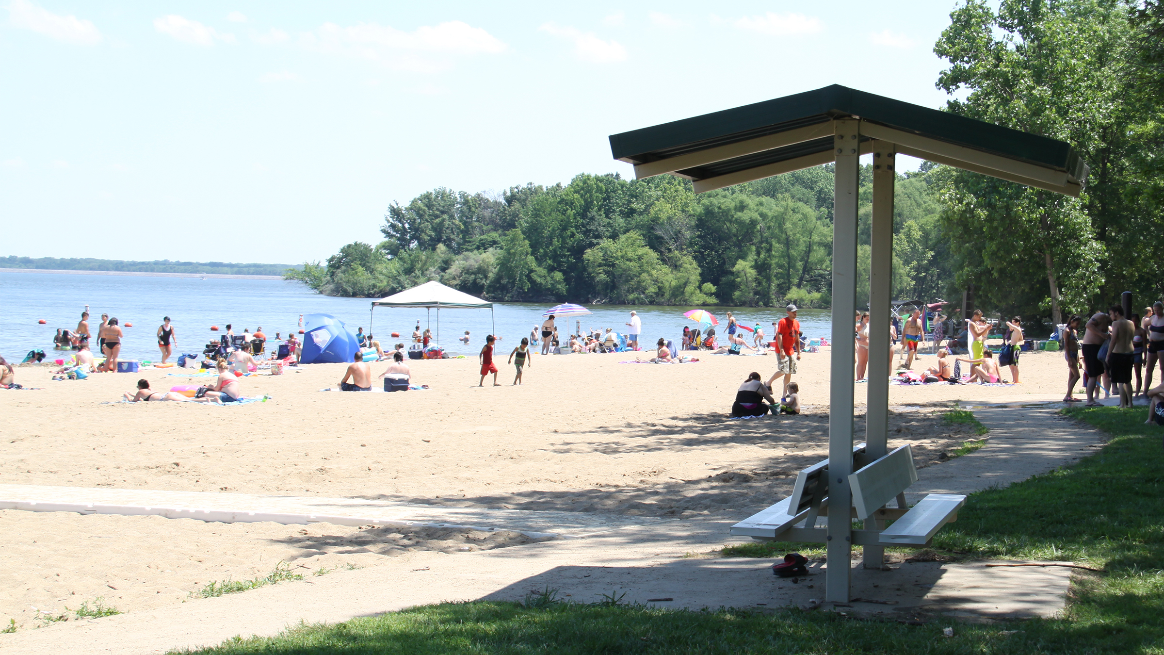 The South Sandusky Beach at Rend Lake offers a large sand area, buoyed swim area, shaded picnic sites, foot showers, large change/shower houses, restroom facilities, walkway down to the water, and two reservable picnic shelters.